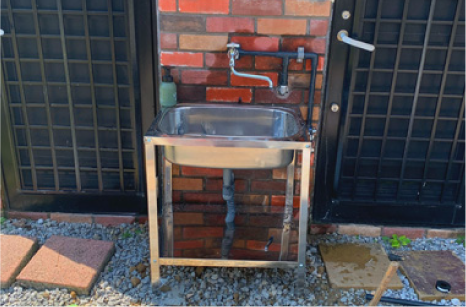 玄関の前にシンク取付しました。家に上がる前には手を洗いましょう!